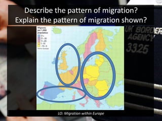1) Migrants have moved from Eastern European countries like Poland and Romania with lower GDPs to Western countries like the UK, France, and Germany which have higher GDPs in search of work and higher wages.