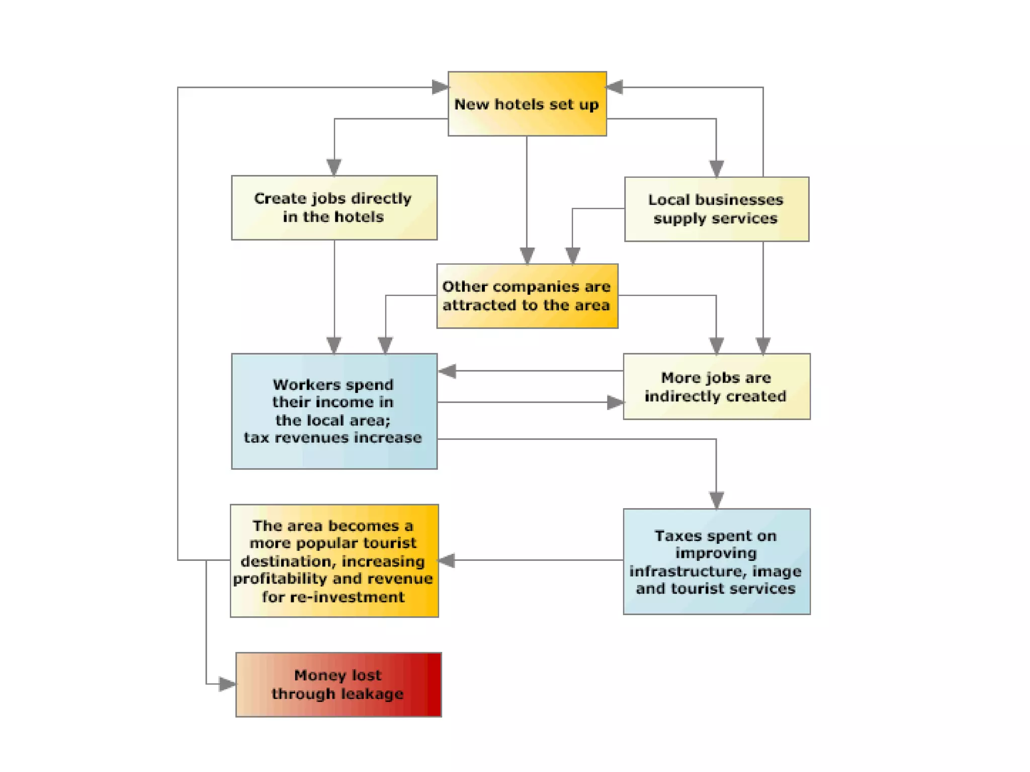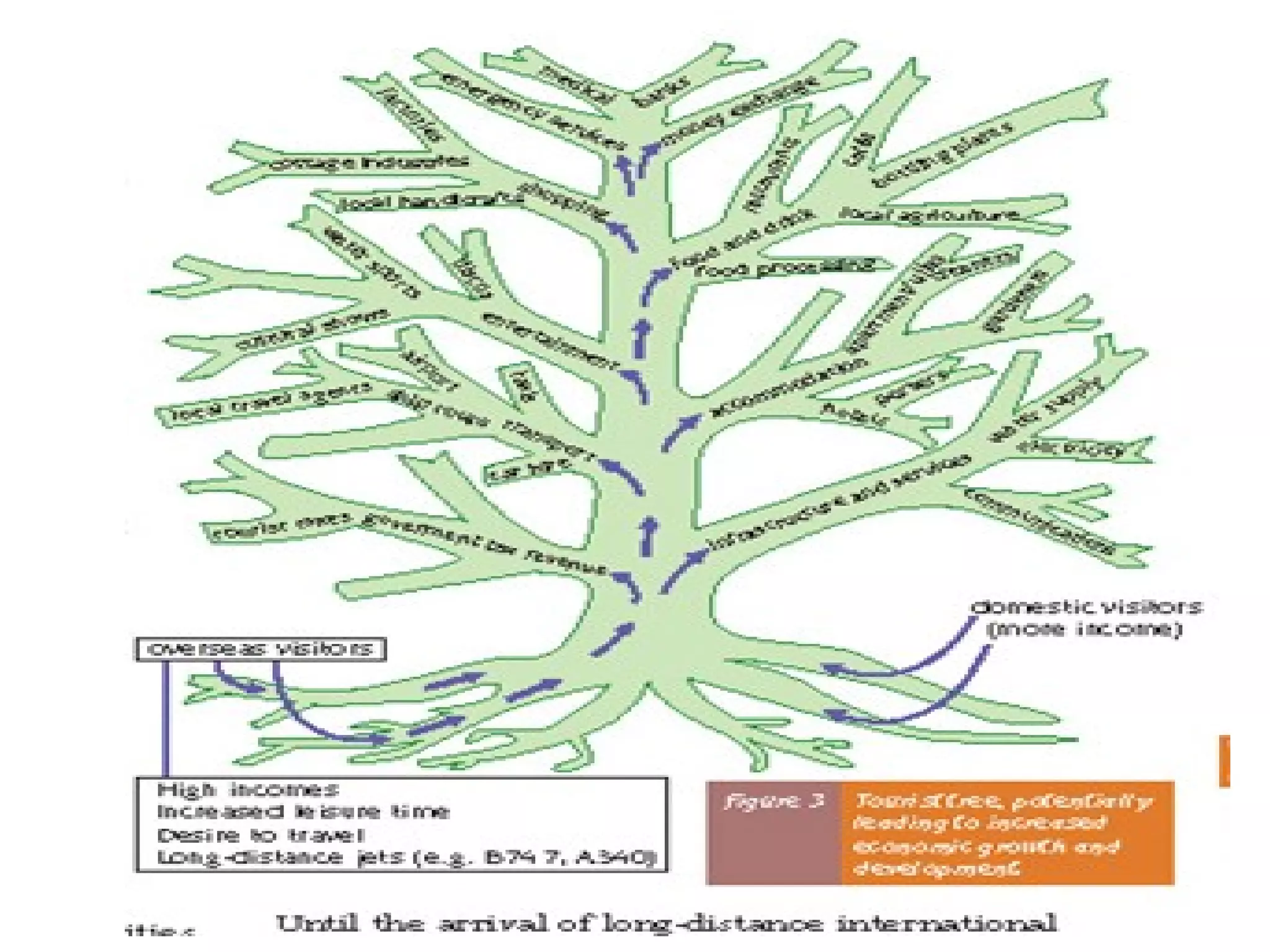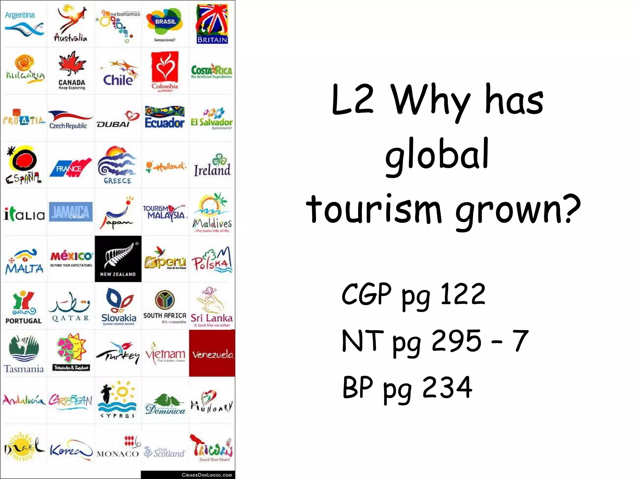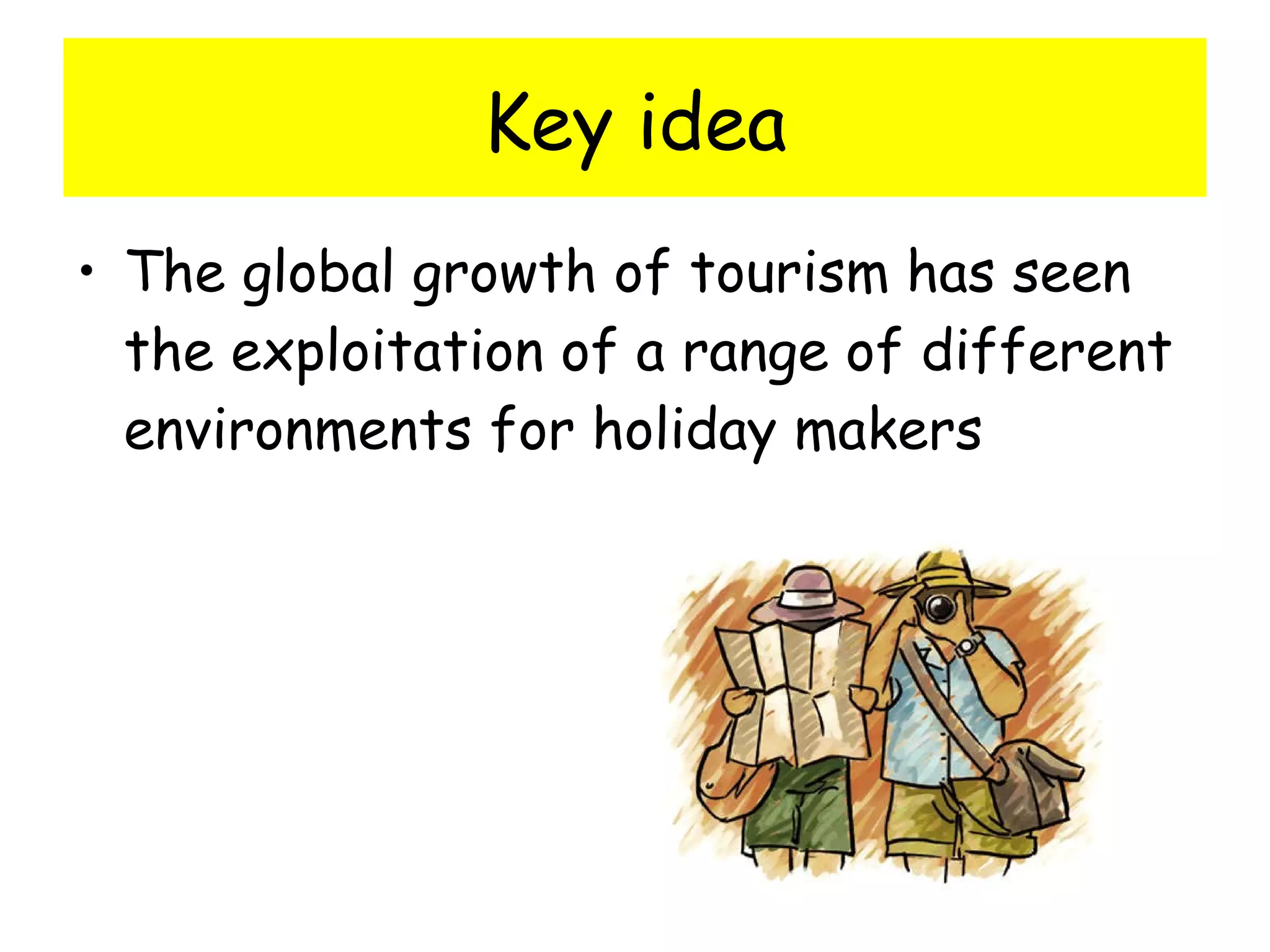 The document discusses the global growth of tourism and its economic importance. It explains that tourism has seen the exploitation of cities, mountains, and coastal areas for holidaymakers. Tourism brings many economic benefits, including increasing the number and variety of service sector jobs, improving infrastructure and public services, supporting local industries, and increasing tax revenues for local and national governments. Many small island countries have benefited greatly from tourism and improved air travel, as it has lessened their dependence on unstable commodity exports and brought a much-needed source of income. Around 80% of Barbados's national income comes from tourism.