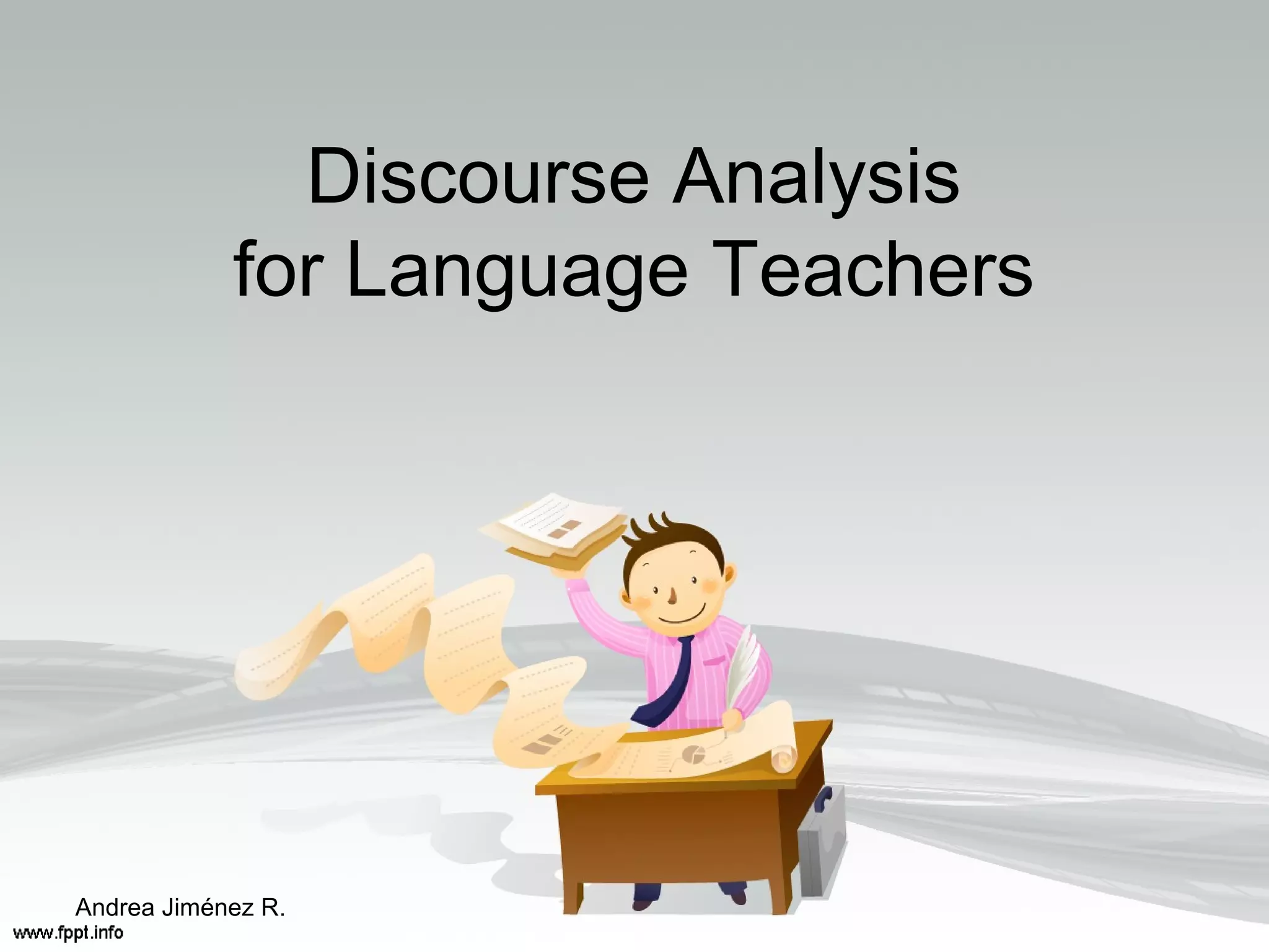 This document provides an overview of discourse analysis. It discusses how discourse analysis studies the relationship between language and the context in which it is used, including both written and spoken language. It also describes several models that have been developed for analyzing different types of spoken discourse, such as the Sinclair and Coulthard model for teacher-student interactions. The document notes that discourse analysis examines both spoken interactions and the organization of written texts, seeking to understand how language forms are interpreted based on participants' roles and the social setting.