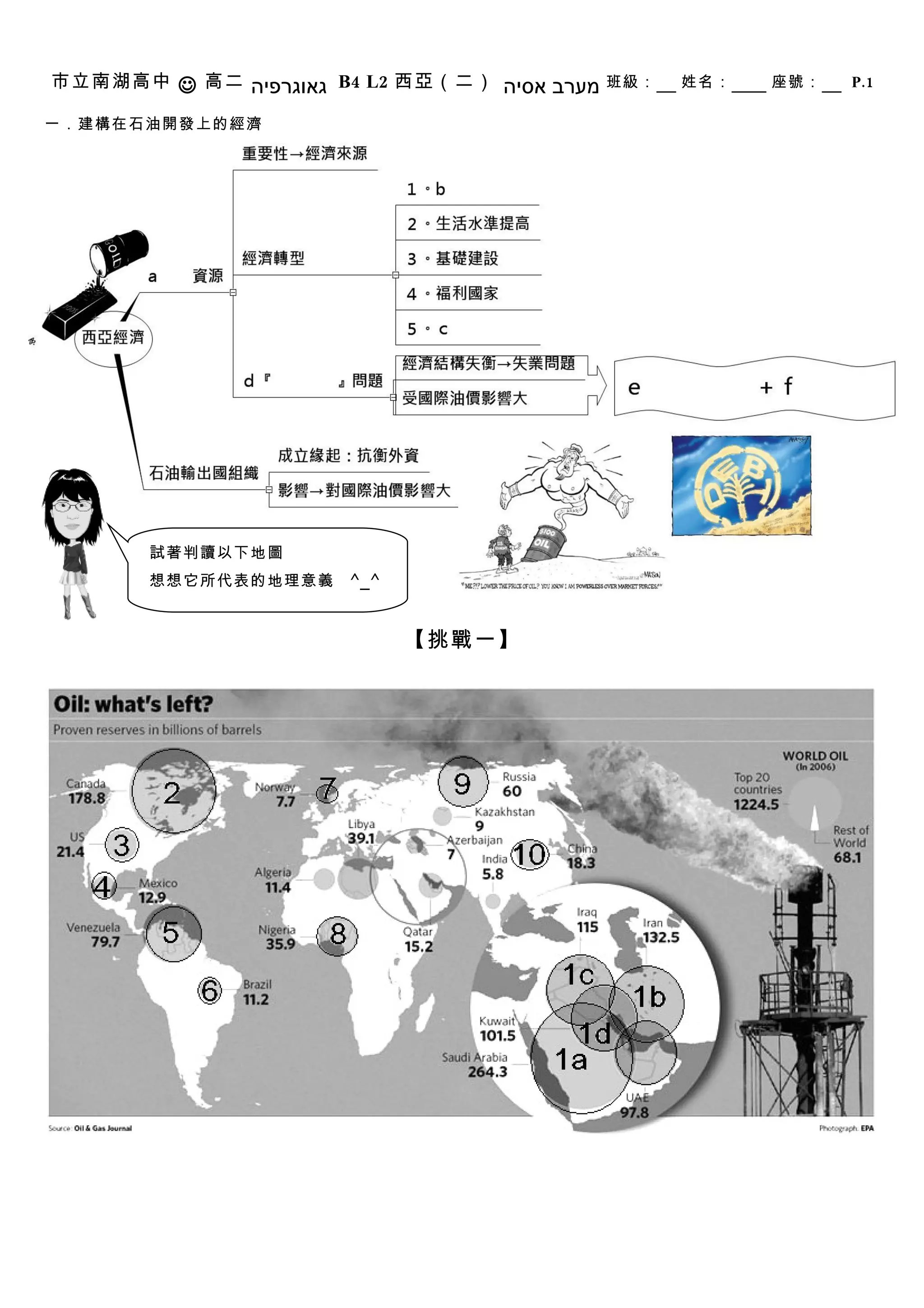 גאוגרפיהB4 L2 西亞(二) מערב אסיה班級: 姓名: 座號: P.1 一.建構在石油開發上的經濟 試著判讀以下地圖 想想它所代表的地理意義 ^_^ 【挑戰一】