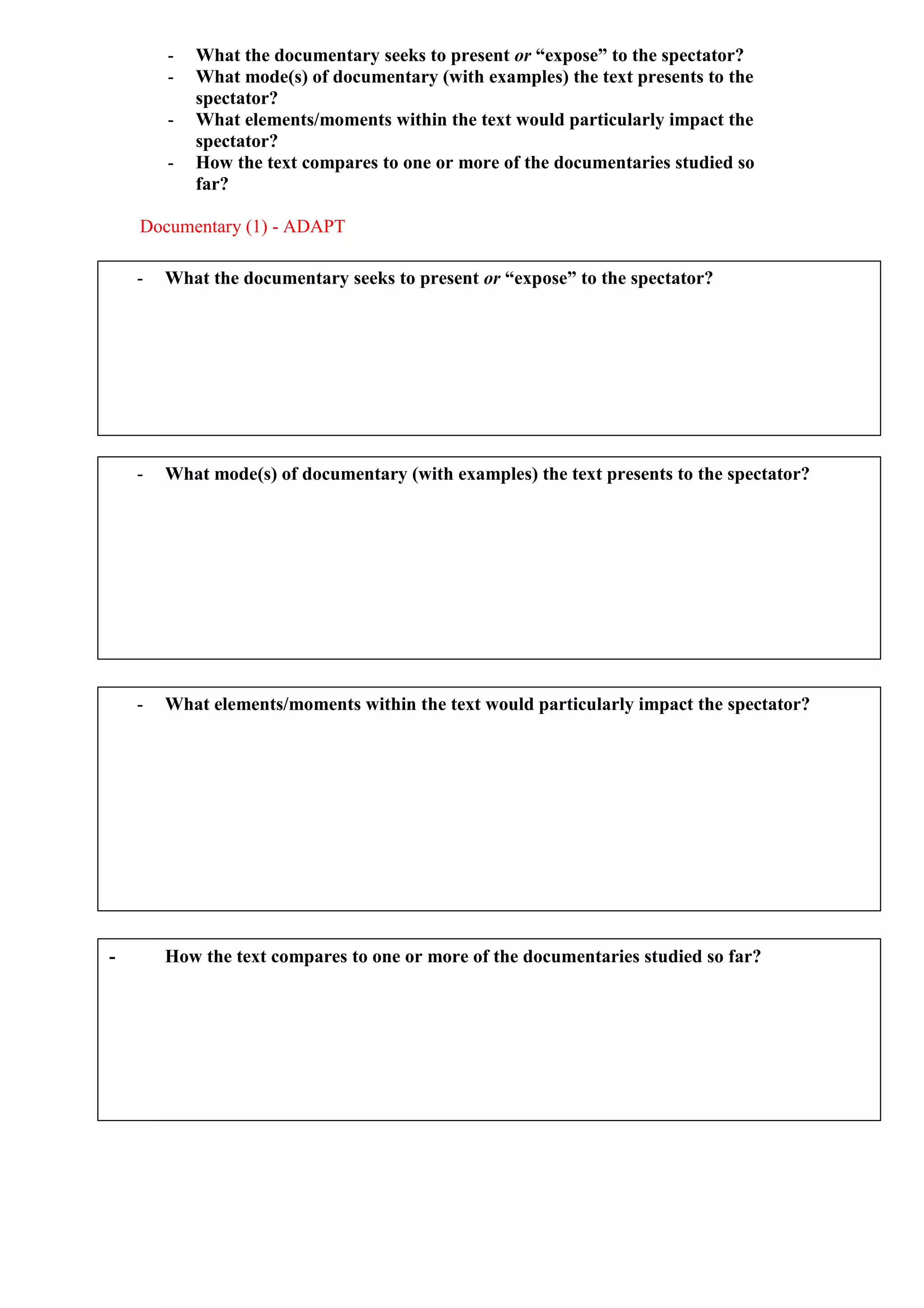 The document discusses how to analyze a documentary film by asking the viewer to consider what the documentary seeks to expose, what documentary modes or styles are used, what elements would particularly impact the viewer, and how it compares to other documentaries studied.