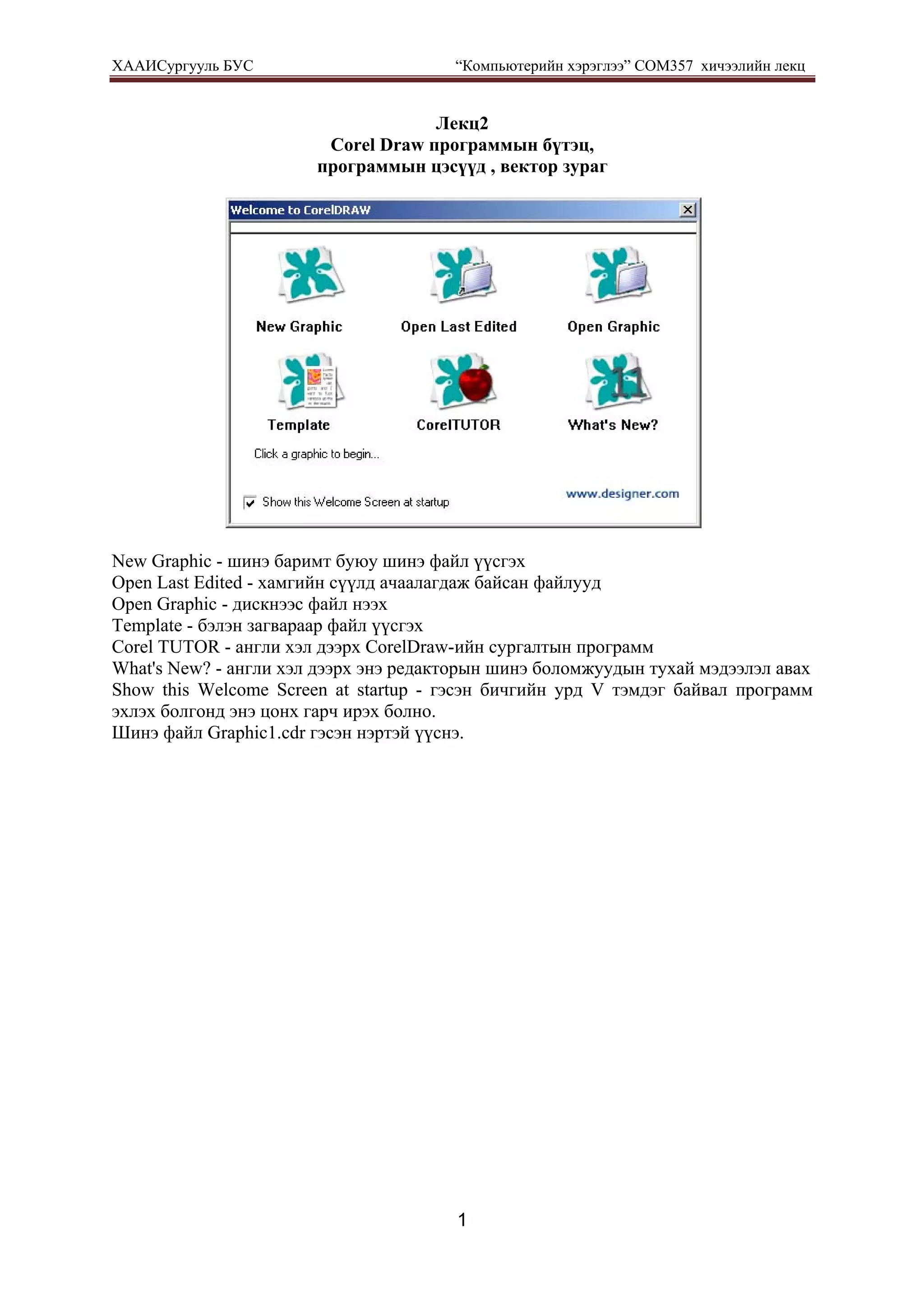 хэрэглээ” COM357 хичээлийн лекц 1 Лекц2 Corel Draw программын бүтэц, программын цэсүүд , вектор зураг New Graphic - шинэ баримт буюу шинэ файл үүсгэх Open Last Edited - хамгийн сүүлд ачаалагдаж байсан файлууд Open Graphic - дискнээс файл нээх Template - бэлэн загвараар файл үүсгэх Corel TUTOR - англи хэл дээрх CorelDraw-ийн сургалтын программ What's New? - англи хэл дээрх энэ редакторын шинэ боломжуудын тухай мэдээлэл авах Show this Welcome Screen at startup - гэсэн бичгийн урд V тэмдэг байвал программ эхлэх болгонд энэ цонх гарч ирэх болно. Шинэ файл Graphic1.cdr гэсэн нэртэй үүснэ.