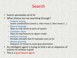 This document discusses search algorithms in artificial intelligence. It describes how search is used to find solutions in many AI problems by exploring possible states. The key aspects covered are: