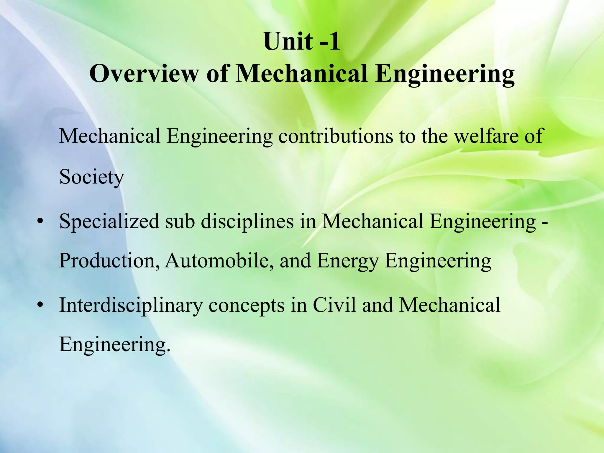 This document provides an overview of mechanical engineering and its contributions to society. It discusses specialized subdisciplines like production, automobile and energy engineering. Automobile engineering section talks about the history and recent developments in automobiles like natural gas vehicles, driverless cars, anti-lock braking systems. Energy engineering deals with different forms of energy sources like solar, wind, tidal, geothermal and hydel power. It also discusses interdisciplinary concepts in mechanical engineering like mechatronics, computer integrated manufacturing, robotics and instrumentation engineering.