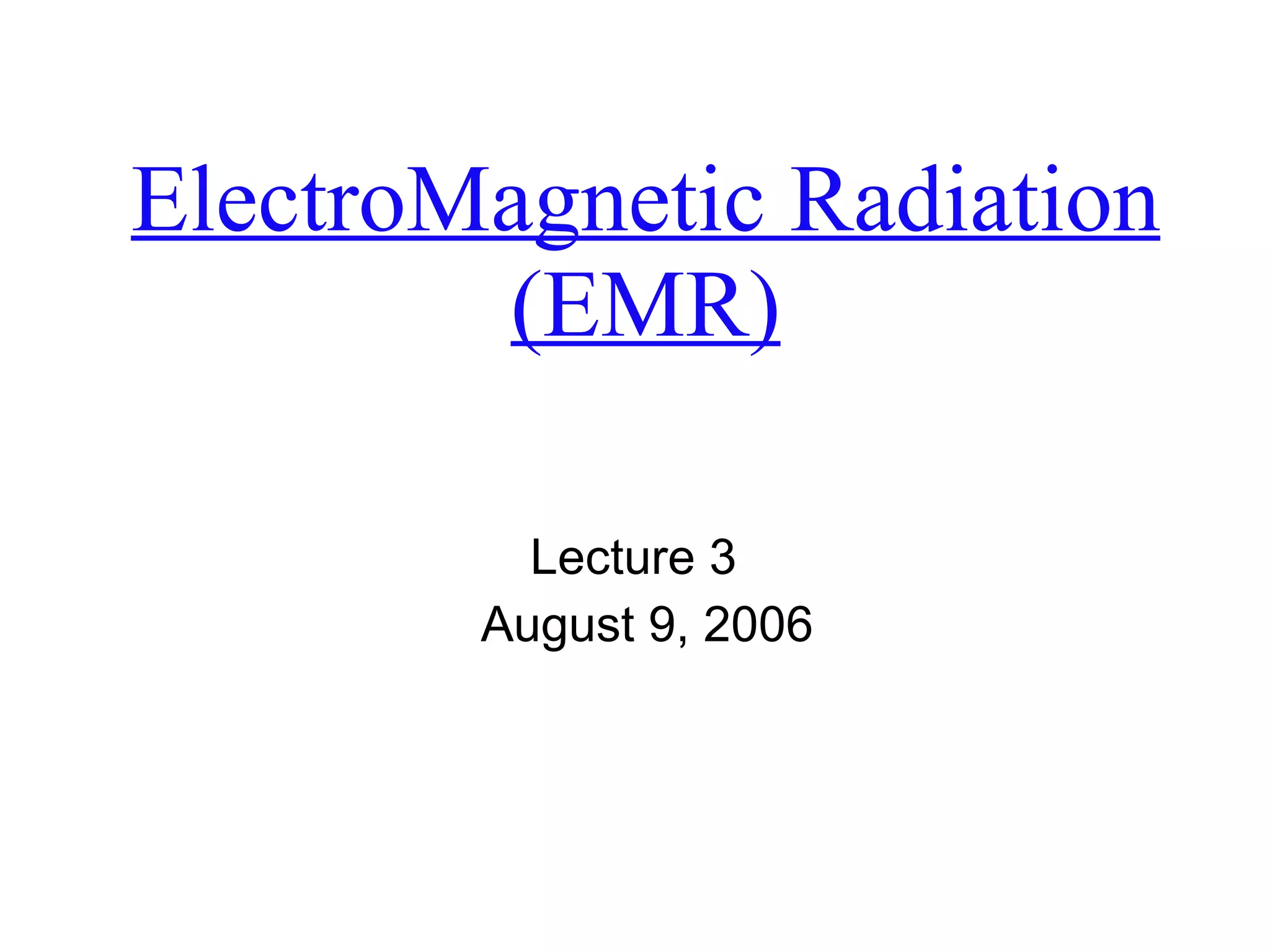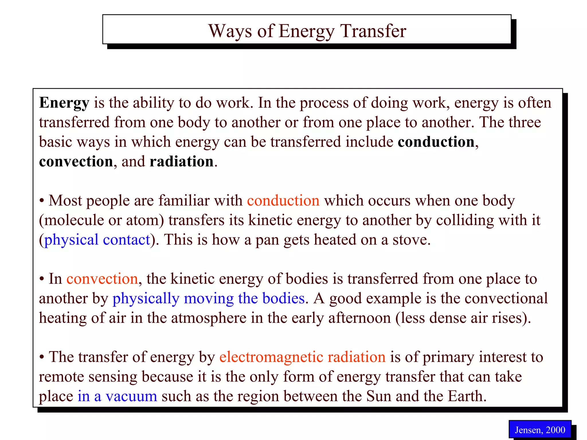 The document discusses three main ways that energy can be transferred: conduction, convection, and radiation. Radiation is the only form that can occur in a vacuum and is therefore important for remote sensing. Electromagnetic radiation consists of oscillating electric and magnetic fields traveling at the speed of light. Remote sensing uses EMR from an energy source like the sun to illuminate targets. EMR interacts with and is affected by the atmosphere and earth's surface in complex ways like absorption, scattering, and reflection before being detected by sensors.