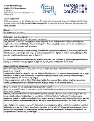 The document is a draft personal statement for Paulina Kucharska's application to Salford City College's BTec Level 3 90 Credit Diploma in Creative Media Production Games Design course. It asks her to answer questions about her dream jobs in the games industry, the skills required, her relevant skills and experience, soft skills, and personal interests. For her dream jobs, she lists concept artist and indie games developer. She discusses the portfolio and skills needed to work in games. For her skills, she mentions digital art, design, programming, and storytelling abilities. She discusses relevant voluntary work painting and working in a charity shop. For skills, she lists both those she has and wants to develop further like communication and