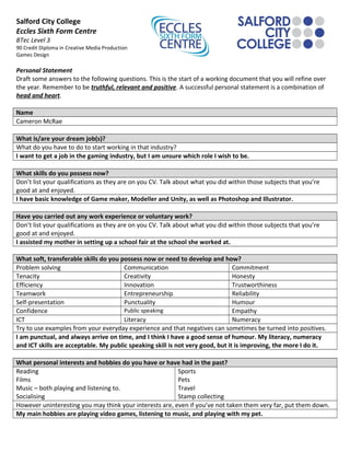 Cameron McRae is drafting a personal statement for a BTec Level 3 90 Credit Diploma in Creative Media Production with a focus on Games Design. He wants to work in the gaming industry but is unsure of which role. He has basic skills in game development tools and design software. He assisted with setting up a school fair to gain work experience. Cameron recognizes skills like punctuality, problem solving, and a good sense of humor. While his public speaking needs improvement, he is working to develop it. His interests include video games, music, and his pet.