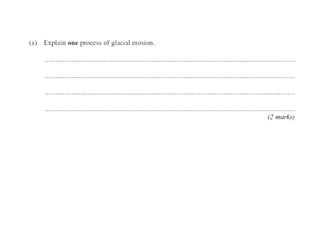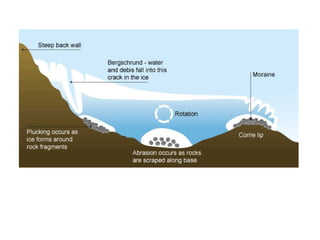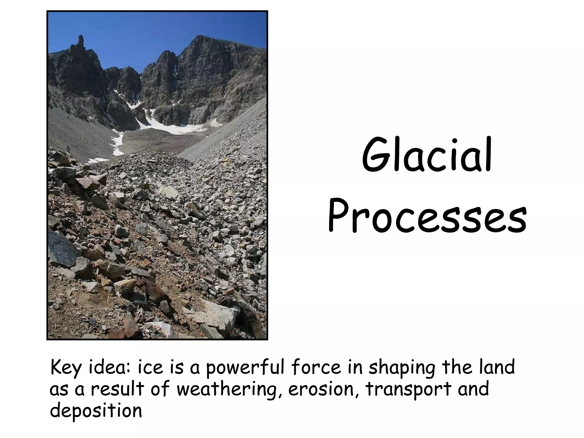 The document discusses key glacial processes including freeze-thaw weathering, erosion through plucking and abrasion, and movement and deposition of material. Freeze-thaw weathering occurs as water enters cracks in bedrock and expands during freezing. Erosion removes rock through plucking, where blocks of rock are torn away, and abrasion, where rock fragments scrape bedrock. Glaciers transport material and eventually deposit moraines when melting reduces their ability to carry material further.