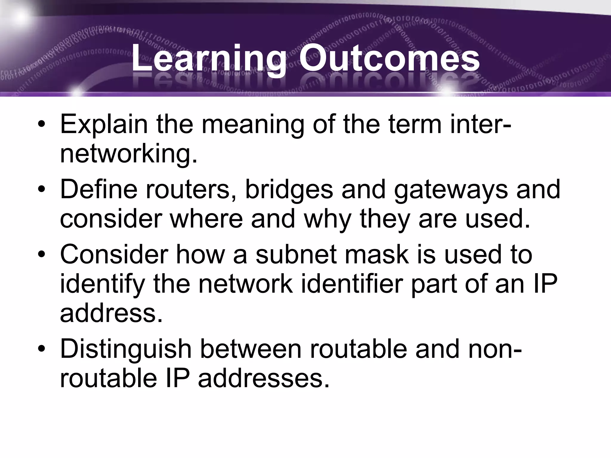 Inter-networking allows computers on different networks to communicate via gateways. Routers and bridges connect different network segments and allow communication between computers on different segments. Routers use destination IP addresses to pass data packets between networks, while bridges maintain a table of addresses to reduce traffic by only forwarding packets with valid destinations. A subnet mask is used to determine if an IP address is local or remote, and routable addresses can be reached by anyone on the internet while non-routable addresses are reserved for internal networks.