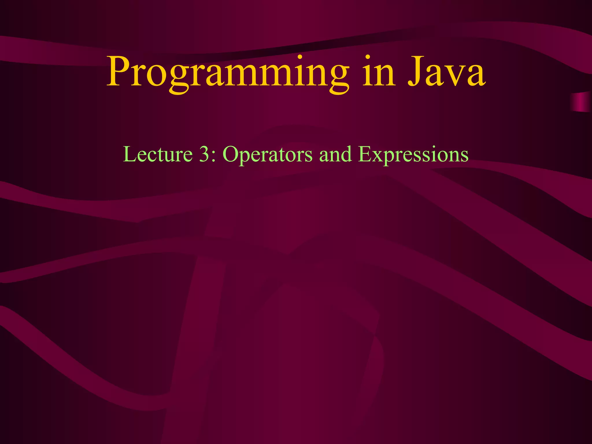 This document summarizes operators and expressions in Java. It discusses the four main categories of operators: arithmetic, bitwise, relational, and logical. For each category, it provides examples of the different operators and how they work. The key points covered include: