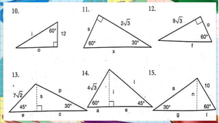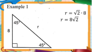 This document discusses special angles and trigonometric ratios. It notes that special angles are called such because their trigonometric ratios can be determined without a calculator. It provides examples of the 30-60-90 and 45-45-90 right triangles and asks the reader to find values of variables in figures using simplest radical form if not an integer. It provides a word problem asking the reader to analyze what is being asked, draw the situation, and show the solution to find the height of a hot air balloon given the angle of elevation and distance to the observation point. It also asks the reader to study the meaning and difference between angle of elevation and angle of depression.