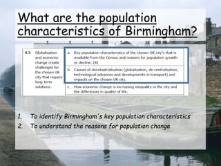 3) Since 2000, Birmingham's population has grown again due to new developments like the Bull Ring and improved transport links like High Speed 2 rail.