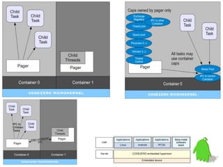 The document provides an overview of the l4 microkernel, discussing its design, functionality, and historical context. It highlights the advantages of microkernels in terms of reliability and security compared to monolithic kernels, while also addressing performance and management issues. Additionally, it outlines the evolution of microkernel generations, culminating in the security-oriented design of sel4, which emphasizes capability-based access control and formal verification.