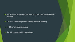 This document discusses miscarriage, ectopic pregnancy, and recurrent miscarriage. It defines miscarriage as pregnancy loss before 24 weeks and notes the most common sign is vaginal bleeding. For ectopic pregnancy, it describes the risk factors, symptoms, and treatments which include expectant management, medical treatment with methotrexate, or surgical treatment. Recurrent miscarriage is defined as 3 or more consecutive losses and investigations and treatments are discussed including aspirin, heparin, surgery for anatomical issues, and psychological support.