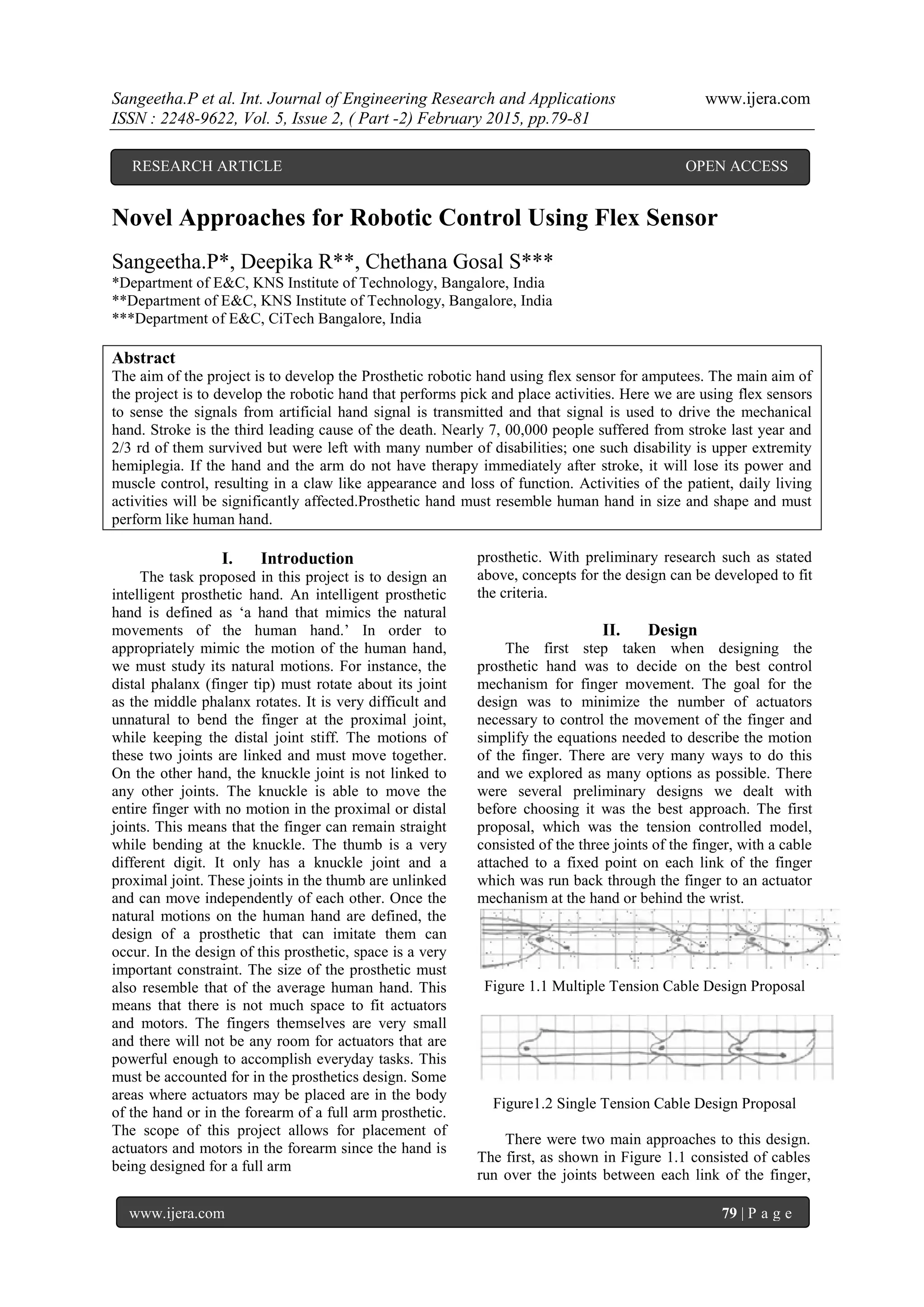 This document details the development of a prosthetic robotic hand using flex sensors to assist amputees, focusing on mimicking natural hand movements. The design incorporates various control mechanisms and aims to optimize actuator placement while ensuring reliable operation for daily tasks. The system is controlled via a data glove with flex sensors that transmit signal data wirelessly to drive the robotic hand's movements.