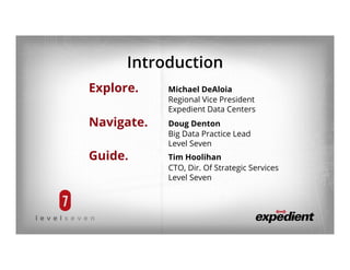 The document outlines a presentation agenda by key figures in big data at Expedient Data Centers, discussing the concept of big data and its implications for business. It highlights the challenges, tools, and strategies for adopting big data technologies, as well as the roles of data scientists in managing vast data sets. The presentation emphasizes the transformational potential of big data across industries and provides insights into initial project ideas for effective implementation.