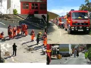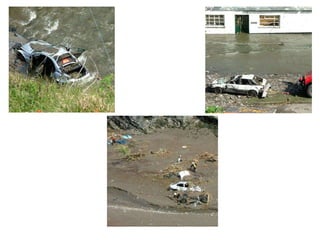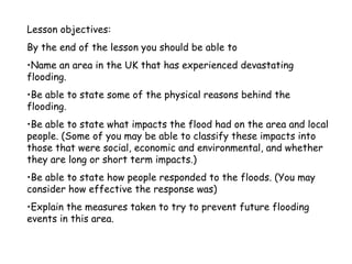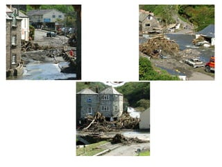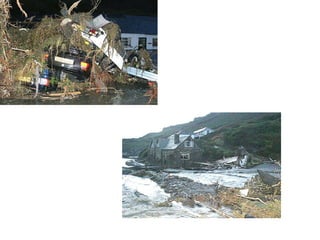 The document describes devastating flooding that occurred in Boscastle, UK in August 2004. Over 200mm of rain fell in 4 hours, with 90mm falling in one hour. This caused two rivers to burst their banks, sending a 3m high wall of water through the village. The flash flooding destroyed homes, businesses and infrastructure. Emergency services conducted a major rescue operation to evacuate stranded residents. Long-term impacts included extensive property damage, economic losses from disrupted tourism, and environmental impacts. The response involved emergency evacuations, followed by a £4.5 million flood defense scheme to mitigate future flooding.