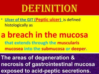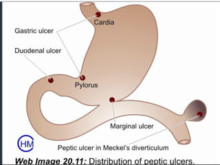 H. pylori plays a crucial role in the pathogenesis of peptic ulcers. It has been found in 90% of patients with chronic gastritis, 95% with duodenal ulcer disease, and 70% with gastric ulcer. Peptic ulcers are caused by a loss of balance between protective and hostile factors in the stomach and duodenum. Factors like H. pylori infection, NSAIDs, and excess acid secretion can damage the mucosal lining, while factors like mucus, bicarbonate, and blood flow work to protect it. Chronic peptic ulcers form in areas of the stomach and duodenum with reduced acid levels. They appear as round or oval lesions that penetrate