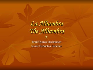 The Alhambra is a 14th century palace and fortress complex in Granada, Spain built by Moorish rulers. It consists of various palaces like the Comares Palace and gardens like the Generalife. After the Christian conquest in 1492, it was altered but still reflects Islamic culture. It is considered one of Spain's most important monuments and a top tourist destination, receiving millions of visits each year.