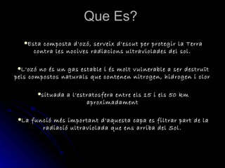 Que Es? Estacomposta d'ozó, serveix d'escut per protegir la Terra contra les nocives radiacions ultraviolades del sol. L'ozó no és un gas estable i és molt vulnerable a ser destruït pels compostos naturals que contenen nitrogen, hidrogen i clor situada a l'estratosfera entre els 15 i els 50 km aproximadament La funció més important d'aquesta capa es filtrar part de la radiació ultraviolada que ens arriba del Sol.