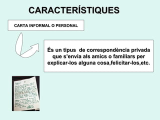 CARACTERÍSTIQUES CARTA INFORMALO PERSONAL És un tipus de correspondència privada que s’envia als amics o familiars per explicar-los alguna cosa,felicitar-los,etc.