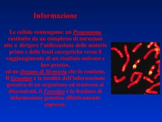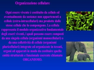 Il documento esplora la storia e i fondamenti della teoria cellulare, evidenziando che tutti gli organismi viventi sono costituiti da cellule, le quali possono essere di diverse forme e dimensioni e svolgono funzioni vitali. Viene descritto la distinzione tra cellule procariotiche ed eucariotiche, il loro funzionamento e le loro componenti principali, inclusi organuli come mitocondri e lisosomi. Inoltre, il testo affronta la formazione e la differenziazione cellulare durante lo sviluppo degli organismi multicellulari.