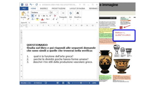 Il documento tratta dell'arte greca e della pittura vascolare, evidenziando la conoscenza dei diversi stili decorativi. Gli studenti sono incoraggiati a ideare decorazioni per vasi greci, ispirandosi ai motivi e alle immagini studiati. Vengono presentati esempi di elaborati realizzati in classe da alunni.
