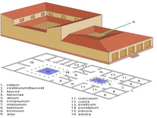 Partien del concepteestructural d’una domus però eren més grans, no presentaven regularitat en la planta i eren situades fora del nucli urbà. Estaven cultivades per arrendataris i supervisades per un administrador ( villicus). VILLA ROMANA Estaven essencialment construïdes al voltant d’un pati i estaven pensades per ser cases de descans per als rics. A vegades tenen atri i peristil, a vegades sols un dels dos, podien tenir pavellons i a vegades estaven construïdes en forma de “U”. (el peristil estava envoltat de columnes, era més gran, es trobava més allunyat de l’entrada de la casa i era més destinat a recepcions socials i de lleure. Com en la domus, el peristil anirà substituint l’atri).