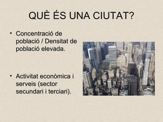 QUÈ ÉS UNACIUTAT? Concentració de població / Densitat de població elevada. Activitat econòmica i serveis (sector secundari i terciari). - 3.