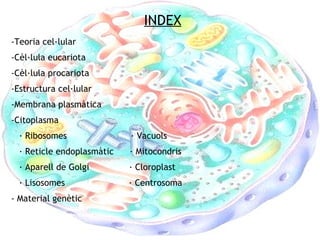 INDEX Teoria cel·lularCèl·lula eucariota Cèl·lula procariota Estructura cel·lular Membrana plasmàtica Citoplasma · Ribosomes · Vacuols · Reticle endoplasmàtic · Mitocondris · Aparell de Golgi · Cloroplast · Lisosomes · Centrosoma - Material genètic