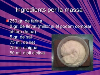 Ingredients per lamassa 250 gr. de farina 8 gr. de llevat (millor si el podem comprar al forn de pa) 5 gr. de sal 75 ml. de llet 75 ml. d’aigua 50 ml. d’oli d’oliva