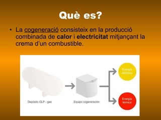 Què es? La cogeneració consisteix en la producció combinada de calor i electricitat mitjançant la crema d’un combustible.