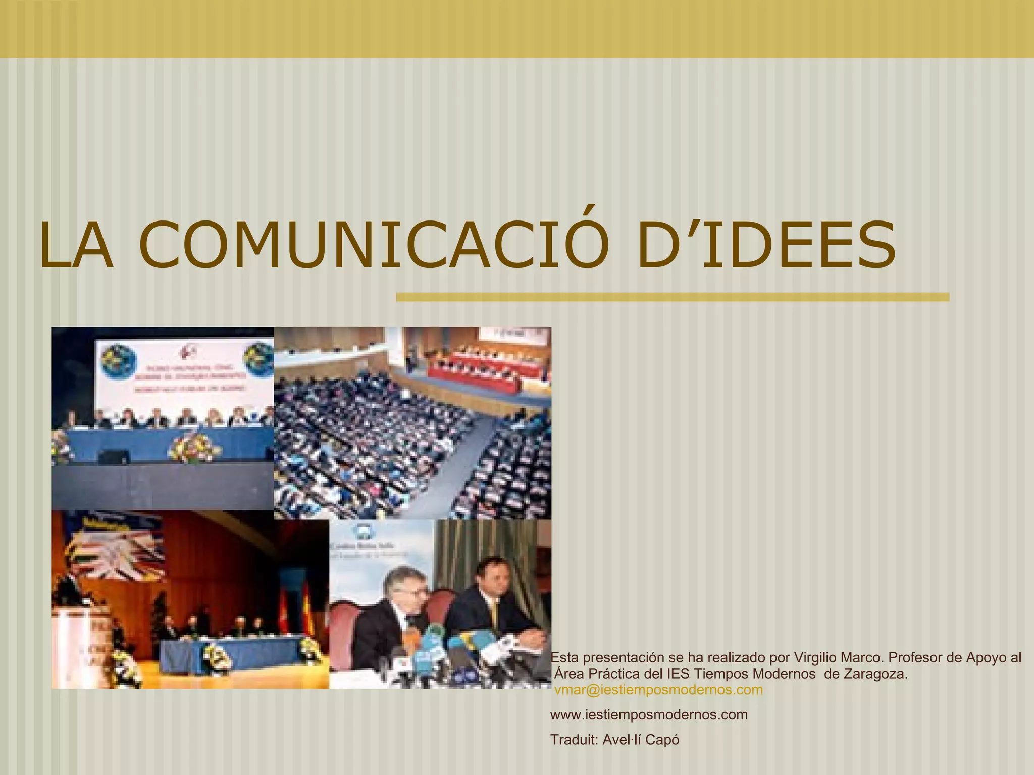 LA COMUNICACIÓ D’IDEESEsta presentación se ha realizado por Virgilio Marco. Profesor de Apoyo al Área Práctica del IES Tiempos Modernos de Zaragoza. [email_address] www.iestiemposmodernos.com Traduit: Avel·lí Capó