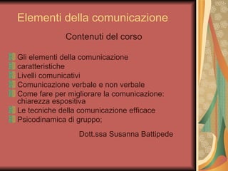 Il documento tratta degli elementi e delle caratteristiche della comunicazione, evidenziando l'importanza di un atto sociale e reciproco di condivisione tra emittente e ricevente. Vengono analizzati i diversi aspetti della comunicazione, sia verbale che non verbale, e vengono forniti consigli per migliorare l'efficacia comunicativa. Si sottolinea che non tutto ciò che si comunica viene ricevuto correttamente, a causa di vari fattori.