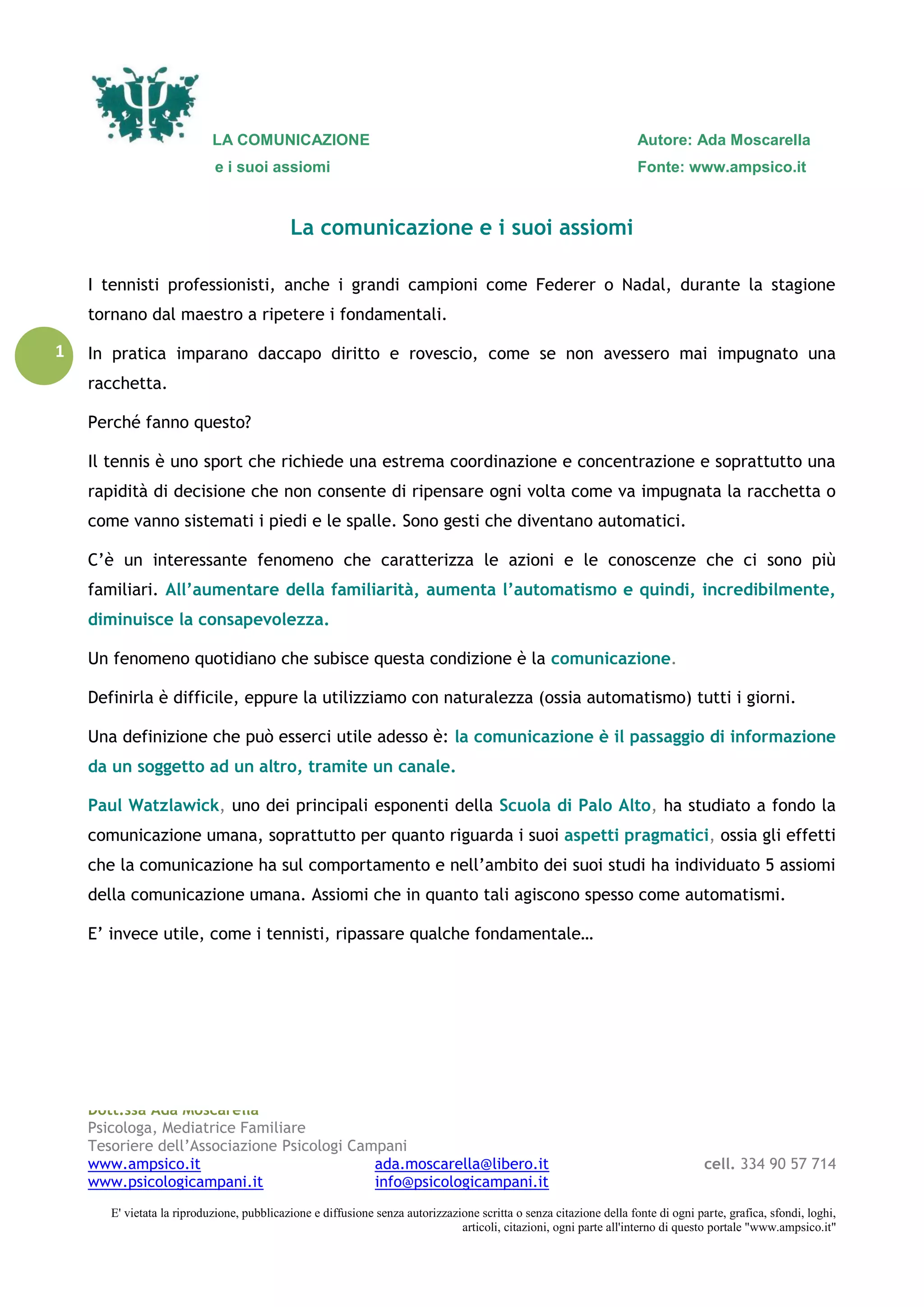 Il documento esplora i principi fondamentali della comunicazione umana secondo Paul Watzlawick, evidenziando cinque assiomi che ne caratterizzano la natura e l'interazione. Questi assiomi includono la impossibilità di non comunicare, la distinzione tra contenuto e relazione, e l'importanza della punteggiatura nelle sequenze comunicative. La comunicazione si svolge sia su un piano verbale che non verbale, e il modo in cui questi elementi si intrecciano determina la qualità delle relazioni interpersonali.