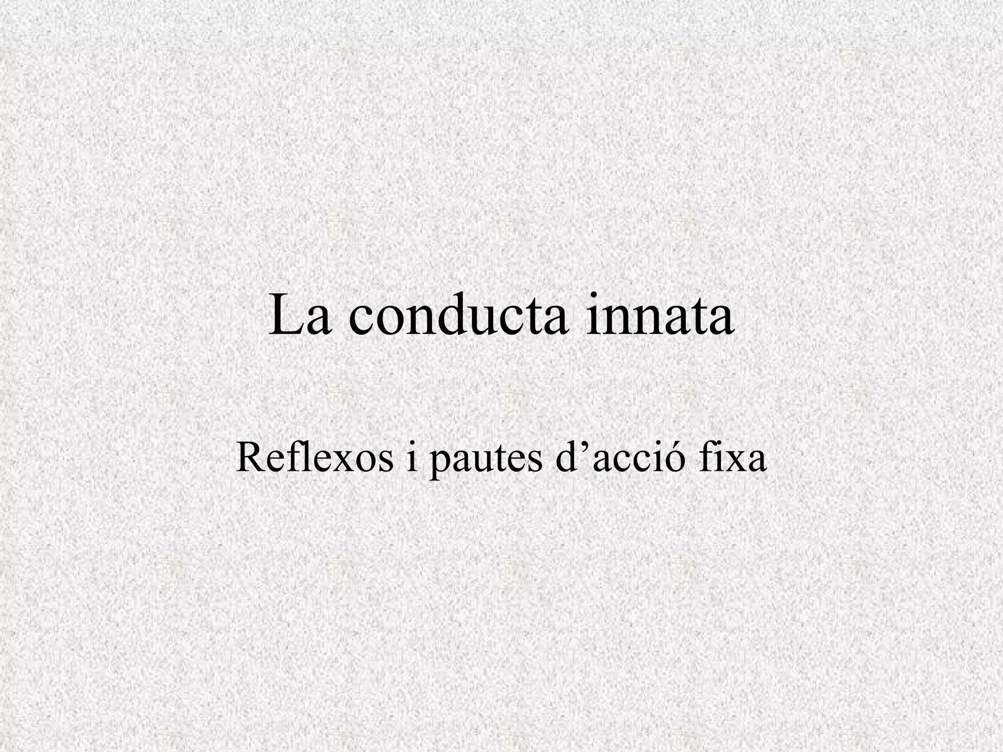 L’aprenentatge: la conductainnata Un reflex consisteix en una resposta innata, automàtica i involuntària que es produeix com a reacció a estímuls específics, que proporcionen un ajust ràpid de la conducta i faciliten el benestar de l’roganisme La conducta reflexa està determinada per l’herència biològica Està sota el control del Sistema Nerviós Perifèric La resposta és generalment de tipus motor Es manifesta es un moviment reflex muscular (arc reflex) Es tracta d’una conducta molt simple Té menor importància biológica que les PAF ELS REFLEXOS