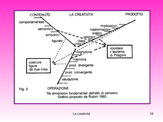 Il documento analizza la creatività, esplorando le sue caratteristiche e teorie, come quelle di Guilford e Torrance, evidenziando componenti come la fluidità, la flessibilità e l'originalità. Viene discussa l'importanza della creatività nel problem solving e nella scoperta di nuove idee, distinguendo tra il problem finding e il problem solving. Si enfatizza anche la rilevanza dell'ambiente nella quale si sviluppa la creatività e i fattori che possono ostacolarla.