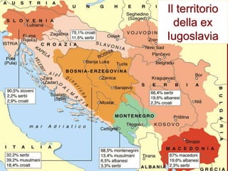 Il documento descrive la storia della ex Jugoslavia, dalla sua nascita nel 1918 all'indipendenza delle repubbliche e alle guerre nei Balcani negli anni '90. Sottolinea l'importanza della figura di Tito nella creazione di un'identità nazionale e la successiva crisi post-morte, che ha portato alla dissoluzione della Jugoslavia e ai conflitti in Bosnia e Kosovo. Vengono inoltre analizzati i complessi equilibri etnici e le difficoltà di costruire uno stato unitario in una regione caratterizzata da una grande varietà di nazionalità e interessi storici contrastanti.