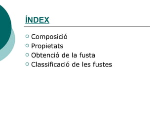 PROPIETATS Higroscopicitat :Capacitat d’absorbir o desprendre humitat. (si absorbeix humitat, s’infla) Flexibilitat : Facilitat per doblegar-se sense trencar-se. Com més humida està la fusta, més flexible és. Fendibilitat : Facilitat per a trencar-se quan el colpegem. La fusta ho és amb molta facilitat quan ho fem en el sentit de les fibres.
