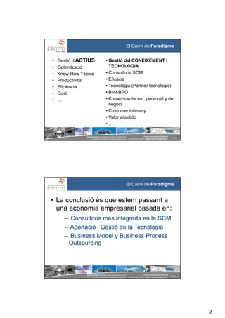 i distribució no autoritzades©2011 info@group-sys.com 3 de 39 Escola Universitària Gimbernat 19 d’octubre de 2011 “Agile Project Management“ • Gestió d’ACTIUS • Optimització • Know-How Tècnic • Productivitat • Eficiència • Cost • … • Gestió del CONEIXEMENT i TECNOLOGIA • Consultoria SCM • Eficàcia • Tecnologia (Partner tecnològic) • BM&BPO • Know-How tècnic, personal y de negoci • Customer intimacy • Valor añadido • … El Canvi de Paradigme SystemGroup Prohibidala reproducció i distribució no autoritzades©2011 info@group-sys.com 4 de 39 Escola Universitària Gimbernat 19 d’octubre de 2011 “Agile Project Management“ • La conclusió és que estem passant a una economia empresarial basada en: – Consultoria més integrada en la SCM – Aportació i Gestió de la Tecnologia – Business Model y Business Process Outsourcing El Canvi de Paradigme