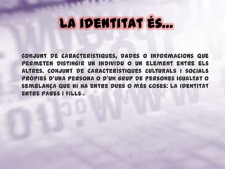 La identitat és…Conjuntde característiques, dades o informacions que permeten distingir un individu o un element entre els altres. Conjunt de característiques culturals i socials pròpies d'una persona o d'un grup de persones Igualtat o semblança que hi ha entre dues o més coses: la identitat entre pares i fills .