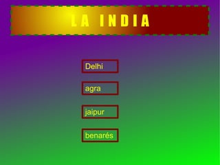 This document lists several major cities in India, with Delhi mentioned multiple times. It mentions Agra, Jaipur, and Benares as cities visited after initially listing Delhi four separate times. The document provides a high-level itinerary of cities traveled throughout India.