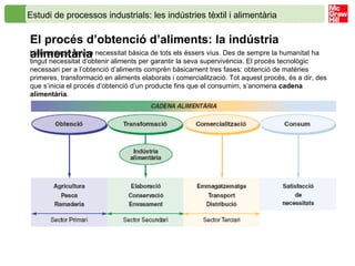 Estudi de processosindustrials: les indústries tèxtil i alimentària El procés d’obtenció d’aliments: la indústria alimentària Fem un repàs de les principals fases de la cadena alimentària: Obtenció de matèries primeres . L’agricultura, la pesca i la ramaderia ens proporcionen la majoria de matèries primeres per a l’alimentació. Algunes matèries primeres ja són aliments que consumim directament tal com s’obtenen; són els anomenats aliments frescos (fruita, verdura, peix, carn...). En canvi, n’hi ha d’altres que consumim després que siguin sotmeses a un procés d’elaboració, com les olives per obtenir oli, el gra de blat per fer farina i després pa, o el raïm per produir vi. Aquests productes transformats o precuinats els anomenem aliments elaborats (embotits, pastes, dolços, pa, oli, vi...). Transformació de matèries primeres en productes elaborats. La majoria dels aliments que consumim són elaborats i, per tant, han sofert alguna mena de procés previ abans d’arribar al consumidor. Aquests processos es duen a terme a les indústries alimentàries i poden ser molt diversos. Els tres més importants són els següents: – Procés d’elaboració . En aquesta fase es produeix la transformació de les matèries primeres en productes elaborats, mitjançant diferents processos tecnològics. – Procés de conservació . Una vegada els aliments ja estan elaborats, cal sotmetre’ls, generalment, a nous processos de transformació amb la finalitat que es conservin molt més temps. – Procés d’envasament . Finalment, i abans que els productes arribin al mercat, cal envasar-los per protegir-los o, simplement, per fer-los més atractius. Comercialització dels aliments elaborats . En la prehistòria, els aliments es produïen i es consumien dins d’una petita comunitat autosuficient; aquest tipus d’economia s’anomenava economia d’autoconsum . Avui dia, vivim en una economia de mercat, la qual cosa vol dir que el productor no genera productes per satisfer el seu consum, sinó per vendre’ls al mercat. La finalitat de la indústria alimentària és donar resposta de manera cada cop més eficient a una necessitat bàsica de l’ésser humà com és l’alimentació. Quan vas a comprar, pots fixar-te que molts aliments provenen de països molt llunyans. És necessària una extraordinària xarxa de transports, magatzems i distribuïdors, per tal que aquests aliments puguin arribar a consumidors tan allunyats del lloc on es produeixen.