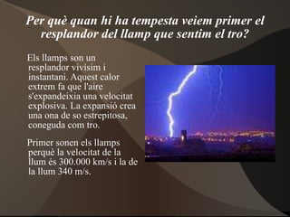 Per què quanhi ha tempesta veiem primer el resplandor del llamp que sentim el tro? Els llamps son un resplandor vivísim i instantani. Aquest calor extrem fa que l'aire s'expandeixia una velocitat explosiva. La expansió crea una ona de so estrepitosa, coneguda com tro. Primer sonen els llamps perquè la velocitat de la llum és 300.000 km/s i la de l a llum 340 m/s.