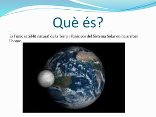 Es l’únicsatèl·lit natural de la Terra i l’únic cos del Sistema Solar on ha arribat