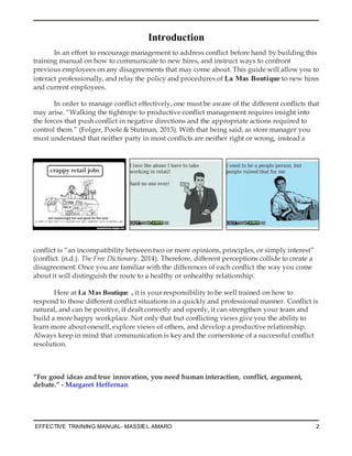This document is a training manual for store managers at La Mas Boutique on addressing conflicts in the workplace. It discusses the different types of conflicts that may arise and five conflict styles: competing, accommodating, compromising, avoiding, and collaborating. It provides guidance on acknowledging conflicts, identifying the real issues, listening to all perspectives, finding resolution options, and getting agreement. Managers are instructed to use a step-by-step process to resolve conflicts effectively through open communication and understanding different viewpoints. Following this approach aims to improve team performance, relationships, and overall workplace satisfaction and productivity. The training manual is recommended to be referenced regularly and used to conduct periodic workshops to maintain conflict resolution skills.