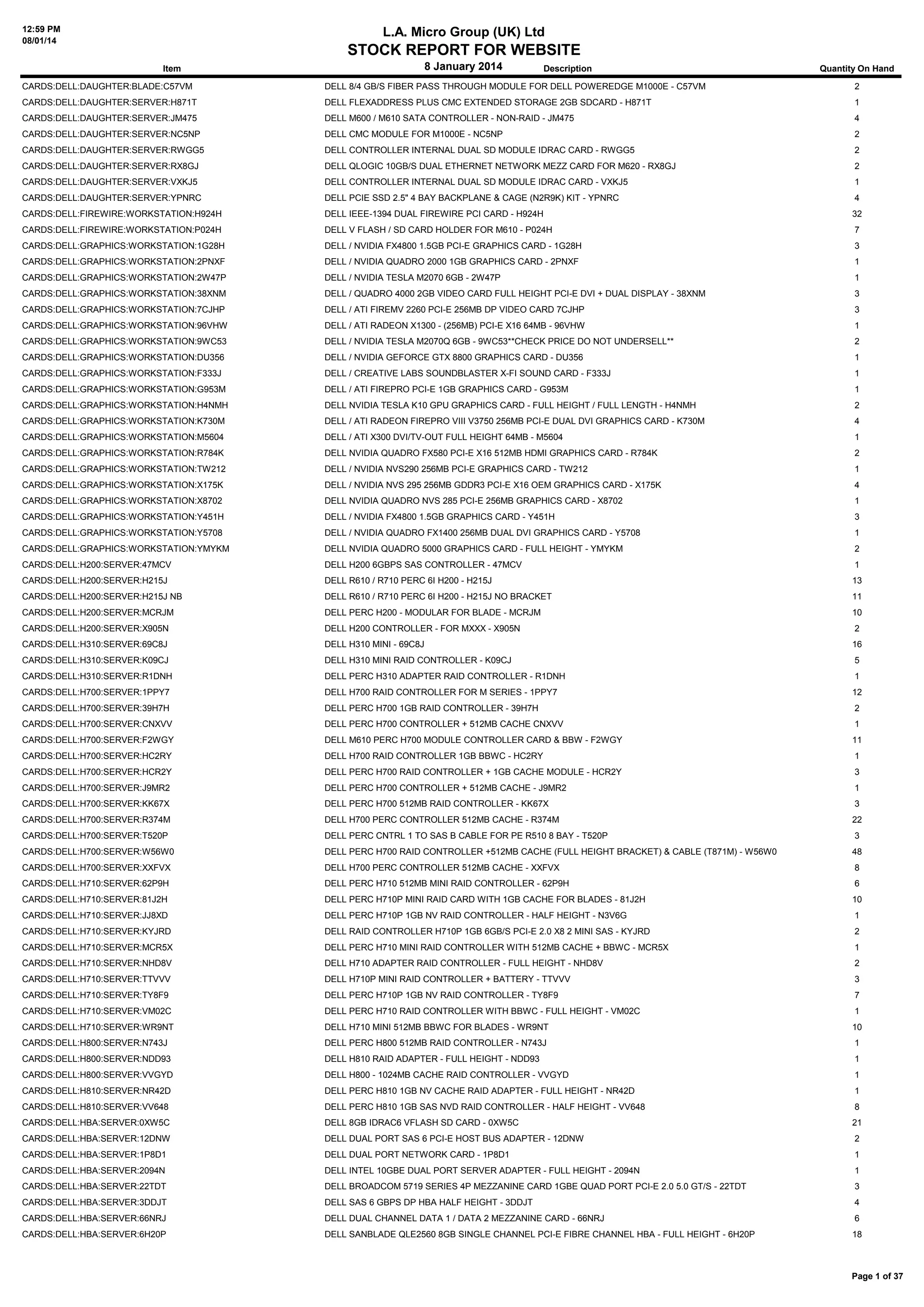 The document is a stock report from L.A. Micro Group (UK) Ltd listing over 100 different Dell networking, storage, and graphics cards with their descriptions and current quantities on hand. It includes cards such as RAID controllers, HBAs, network interface cards, and graphics cards. The report provides an inventory of spare and replacement Dell cards and components available for purchase.