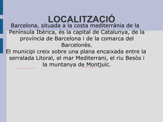 LOCALITZACIÓ Barcelona, situadaa la costa mediterrània de la Península Ibèrica, és la capital de Catalunya, de la província de Barcelona i de la comarca del Barcelonès. El municipi creix sobre una plana encaixada entre la serralada Litoral, el mar Mediterrani, el riu Besòs i la muntanya de Montjuïc.