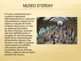 Parigi ospita importanti musei dell'impressionismo, tra cui il museo d'Orsay, il museo Marmottan e il museo dell'Orangerie, ognuno con opere emblematiche. Il museo d'Orsay è famoso per le sue opere di artisti come Mary Cassatt e Frédéric Bazille, mentre l'Orangerie è conosciuto per il ciclo delle Ninfee di Claude Monet. Il museo Marmottan ospita la più grande collezione di opere di Monet al mondo, insieme a lavori di altri artisti impressionisti.