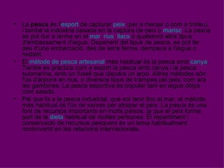 La pesca és l' esport de capturar peix (per a menjar o com a trofeu), i també la indústria basada en la captura de peix o marisc . La pesca es pot dur a terme en el mar , rius , llacs o qualsevol altre tipus d'embassament d'aigua. Depenent del tipus de pesca, es pot fer des d'una embarcació, des de terra ferma, dempeus a l'aigua o nedant. El mètode de pesca artesanal més habitual és la pesca amb canya . També es practica com a esport la pesca amb canya i la pesca submarina, amb un fusell que dispara un arpó. Altres mètodes són l'ús d'arpons en rius, o diversos tipus de trampes pel peix, com ara les gambines. La pesca esportiva és popular tant en aigua dolça com salada. Pel que fa a la pesca industrial, que sol tenir lloc al mar, el mètode més habitual és l'ús de xarxes per atrapar el peix. La pesca és una font de recursos importants en molts països, ja que el peix forma part de la dieta habitual de moltes persones. El repartiment i conservació de recursos pesquers és un tema habitualment controvertit en les relacions internacionals.